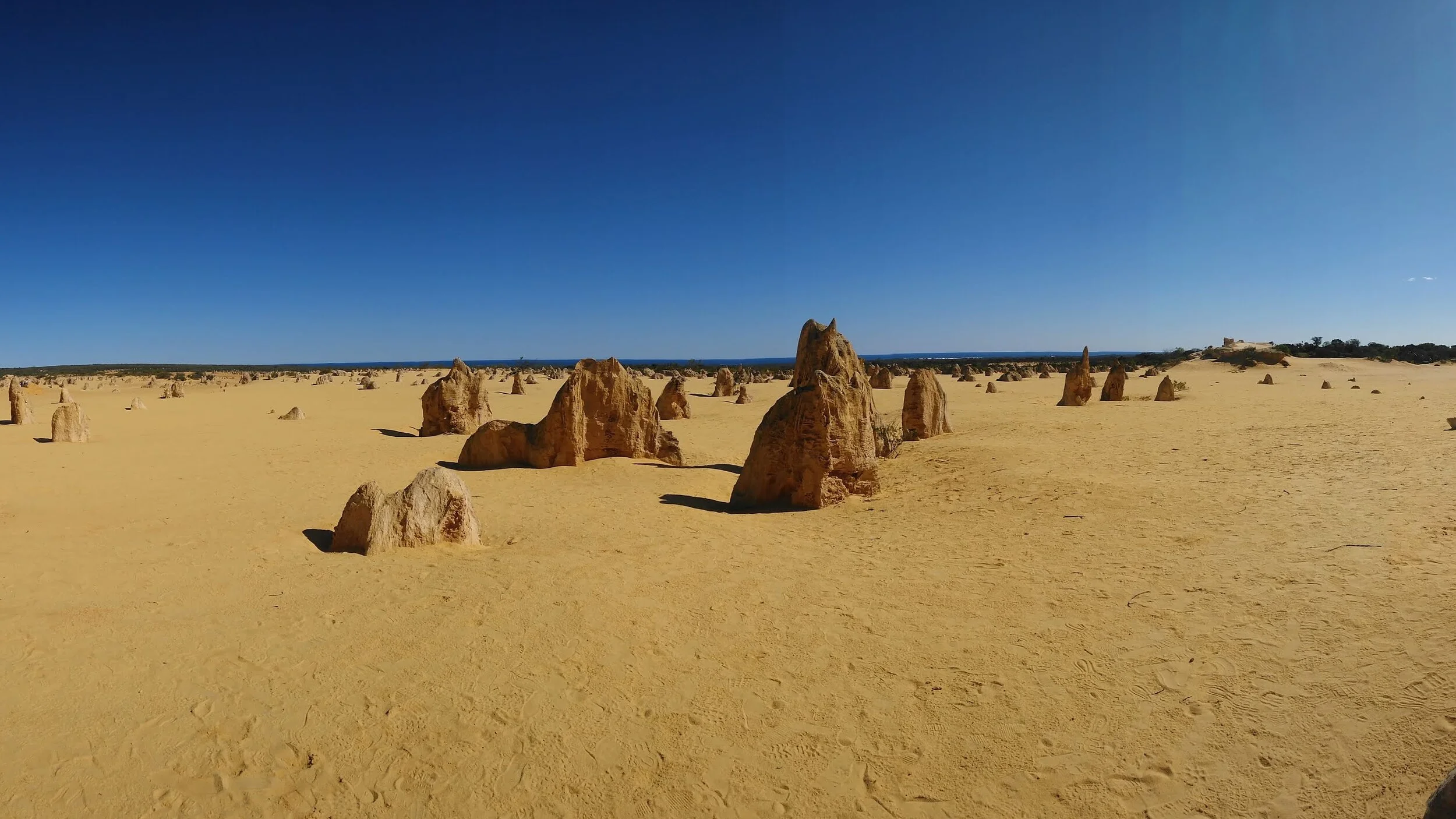 荒野の墓標という異名をもつピナクルズ。背の高いものは4mにも及ぶ大きな岩。数千個も並ぶ姿は圧巻です。この無数の奇岩石がどのようにできたのか、ガイドがじっくり解説します。異空間に迷い込んだような感覚をお楽しみください。 |